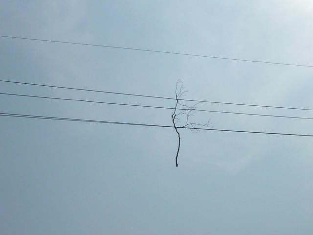 朝、チャリンコをこいでると電線に枝が引っかかってるのが目に入りました。