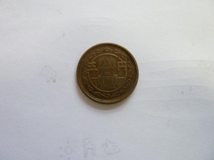 この穴が空いてない5円玉は昭和23年だけ製造されたらしく、昭和24年からは穴あきの筆五になったそうです。