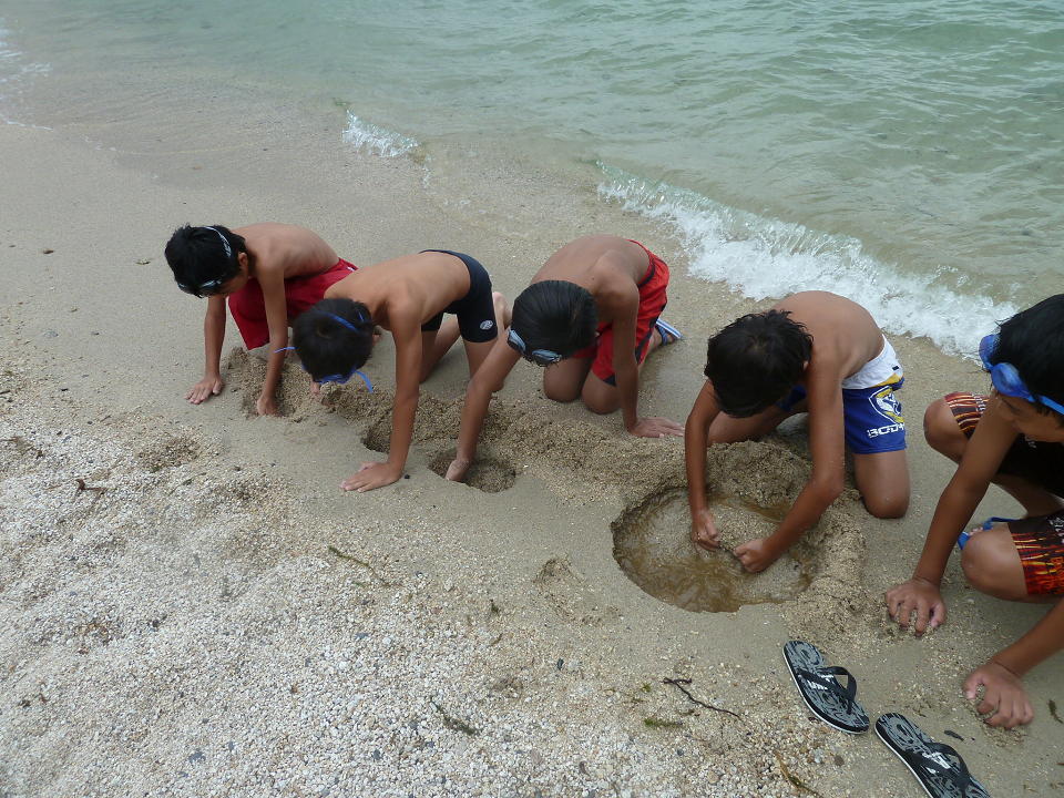 12時になったのでご飯食べようと言ってもなかなか遊びをやめず、上がって来たかと思ったら今度は砂の掘り合いを始めてました。