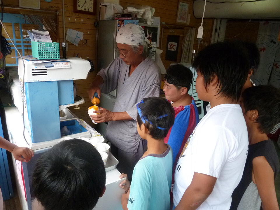 お昼は海の家ならぬ「湖の家」でカップラーメンやカレーなどを食べた後、かき氷に目がくらんだ子ども達。
