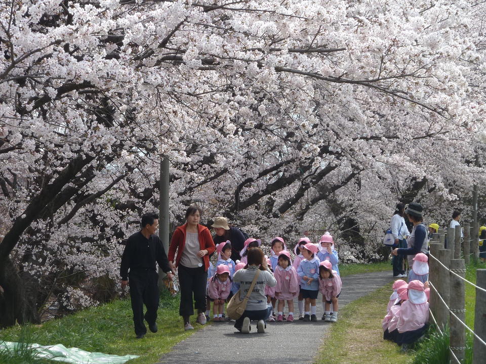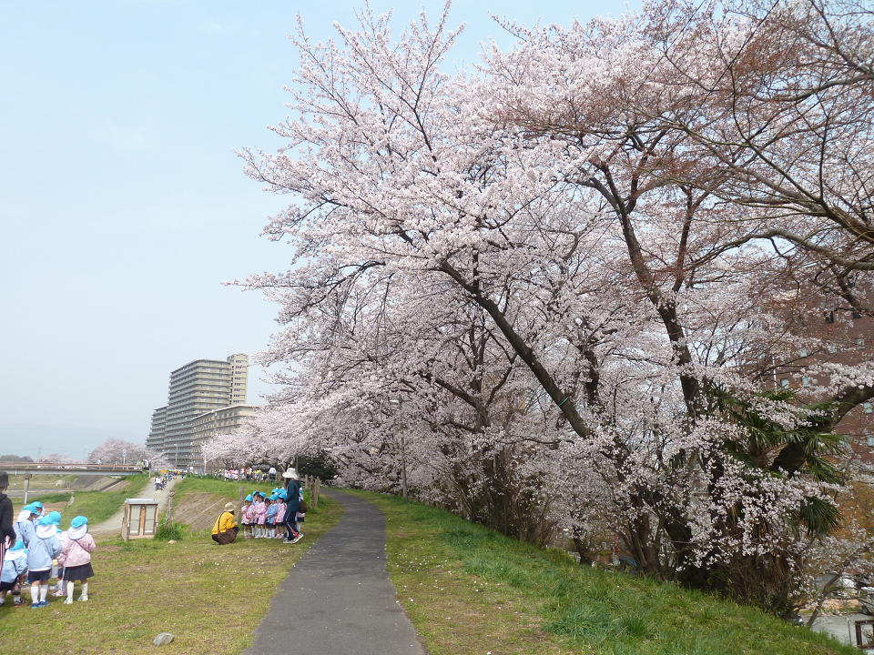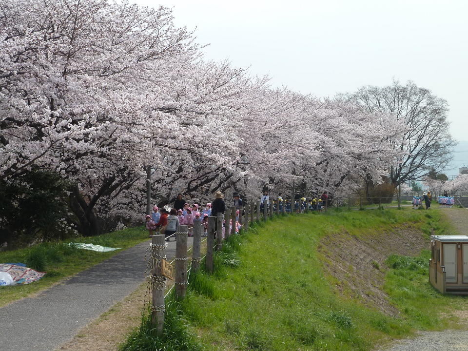 堤防に沿って桜並木が続いています。