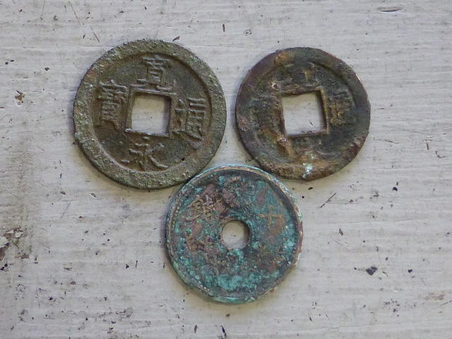 上の2つは寛永通宝という江戸時代の貨幣で、下のは大正時代の十銭玉。