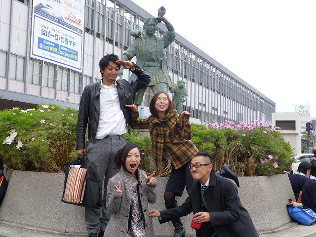 桃太郎の銅像の前で記念撮影して、いざ会場へ。