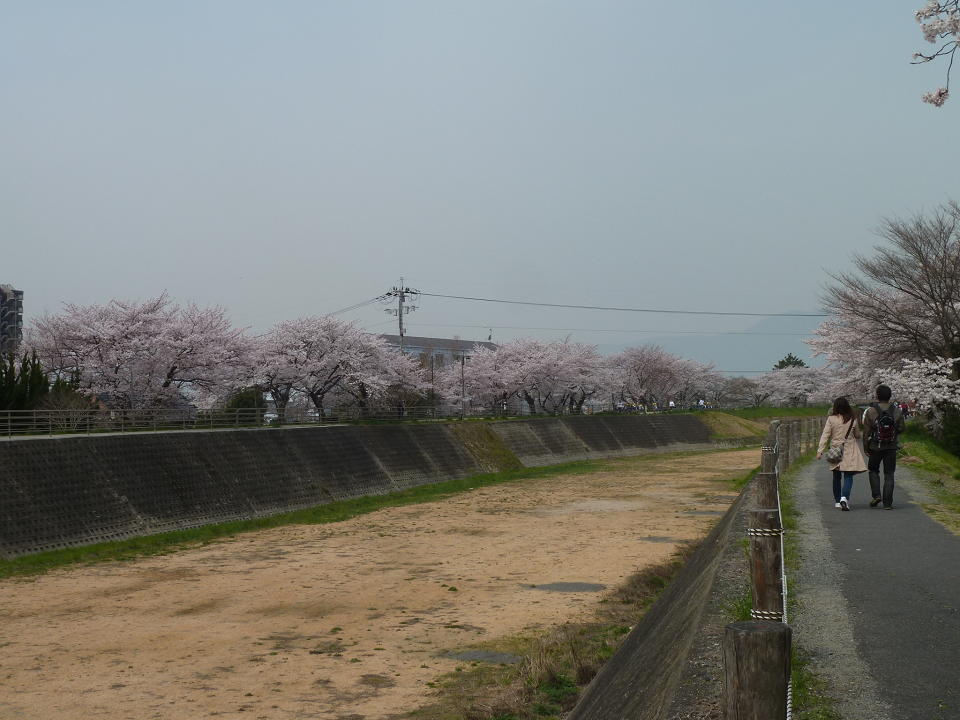 堤防に沿って桜並木が続いています。
